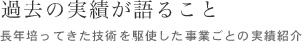 ものに寄っては、掲載できる内容が限られてしまうものもございますが、弊社の実績を見てもらうことが、一番のお客様への良き判断に繋がると思います。弊社が自身を持って紹介する数々の実績をどうぞご覧ください。